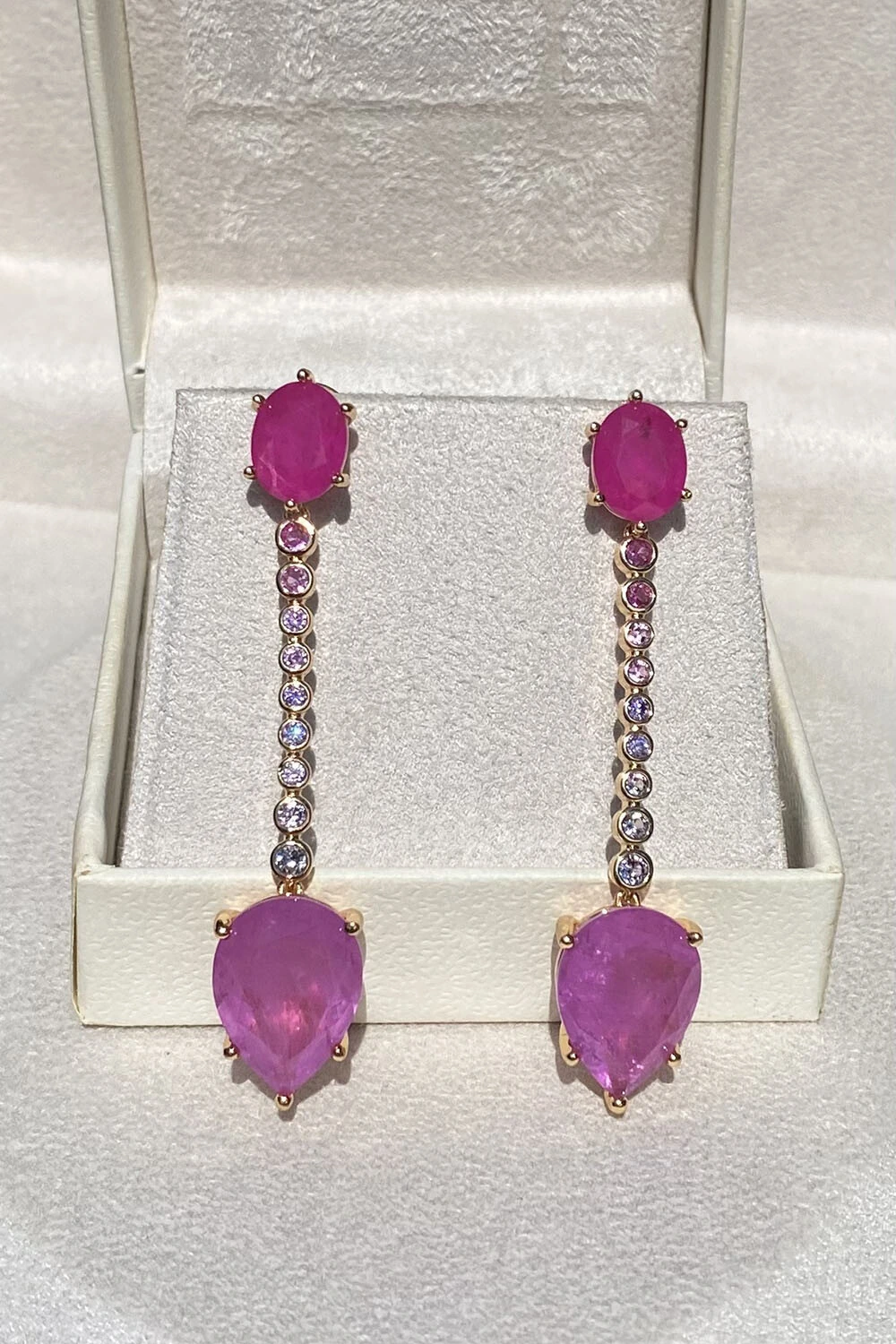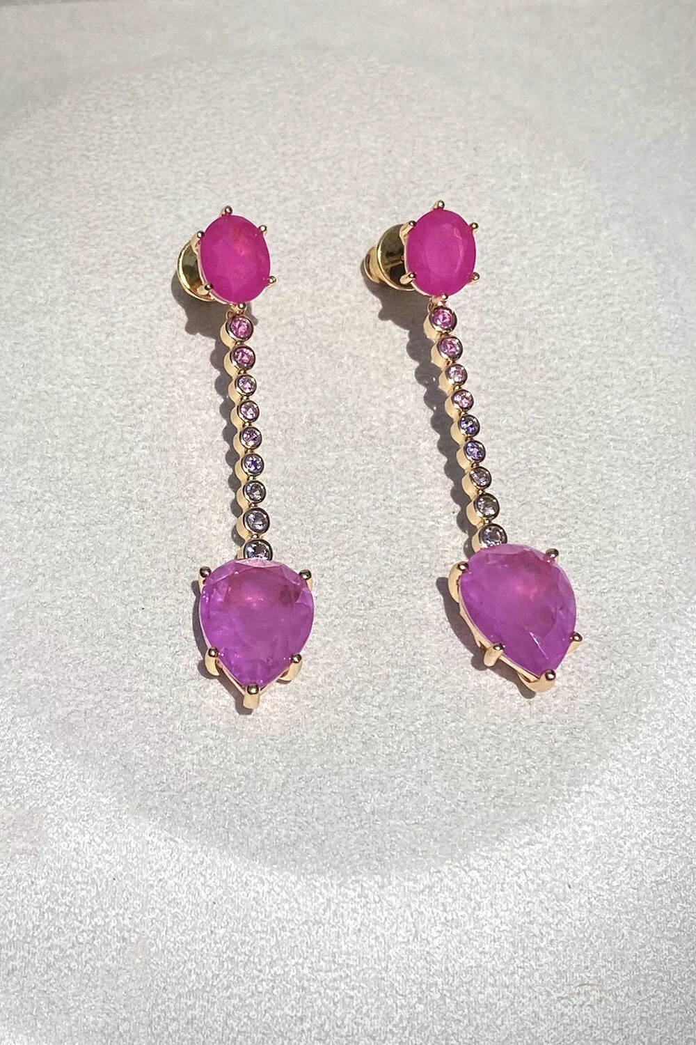 Brinco longo pedra fusion pink com detalhes zircônias coloridas, metal com banho no ouro 18k .