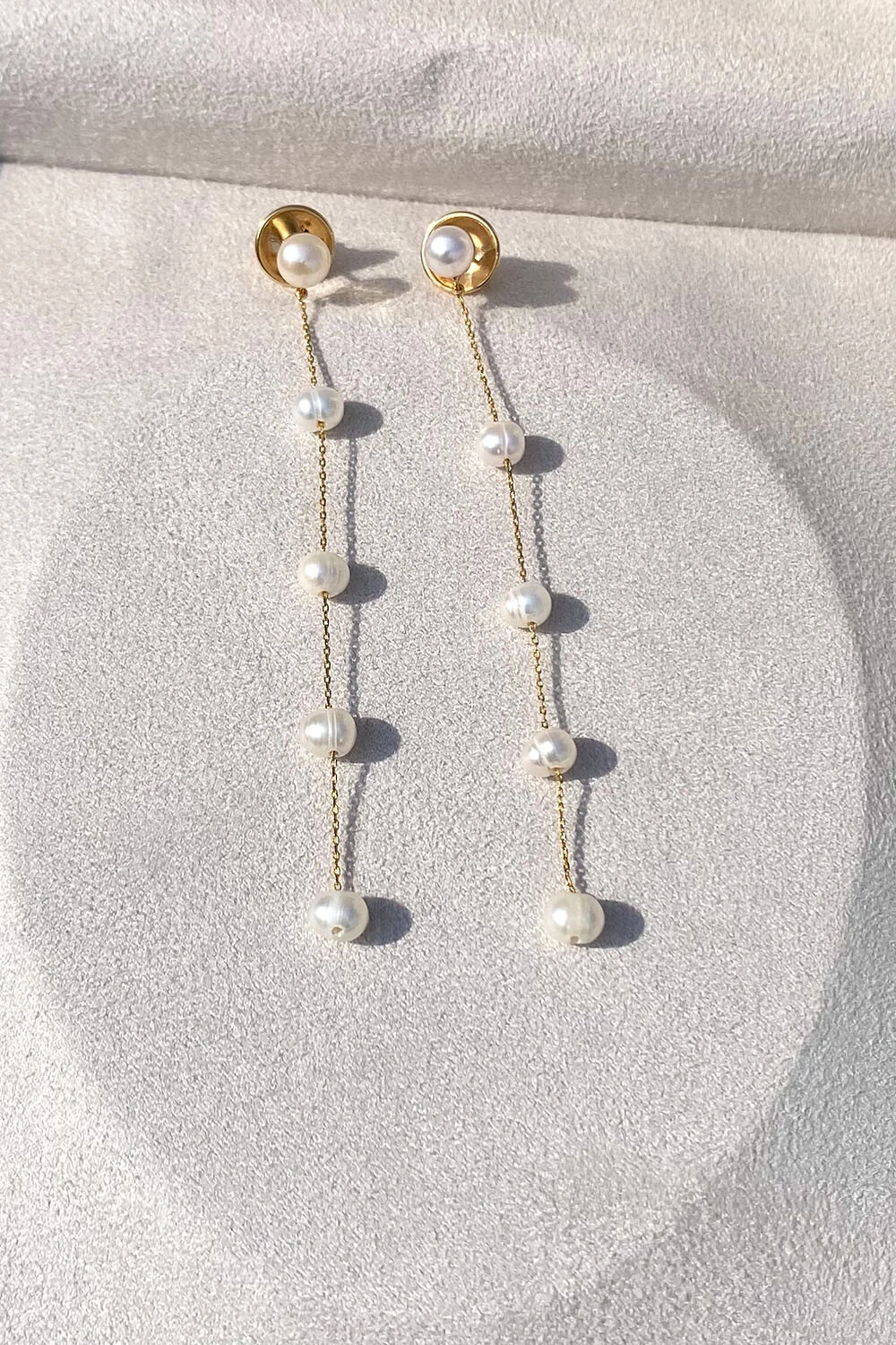 Brinco longo de corrente com cinco pérolas naturais de água doce.