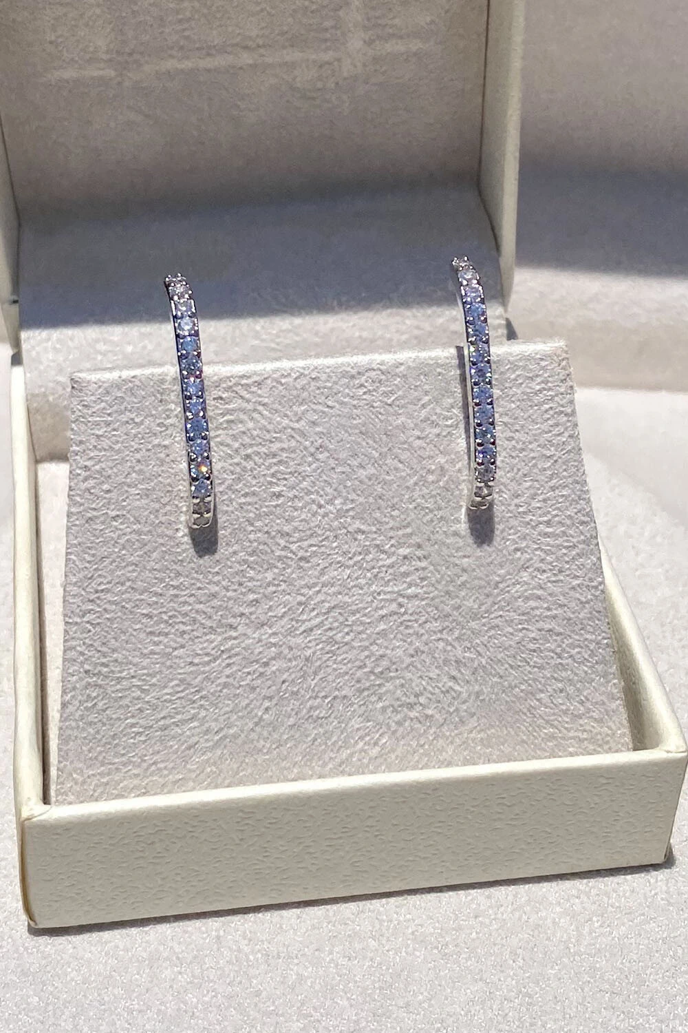 Brinco earhook cravejado com zircônias na cor cristal, metal banhado no ródio branco.