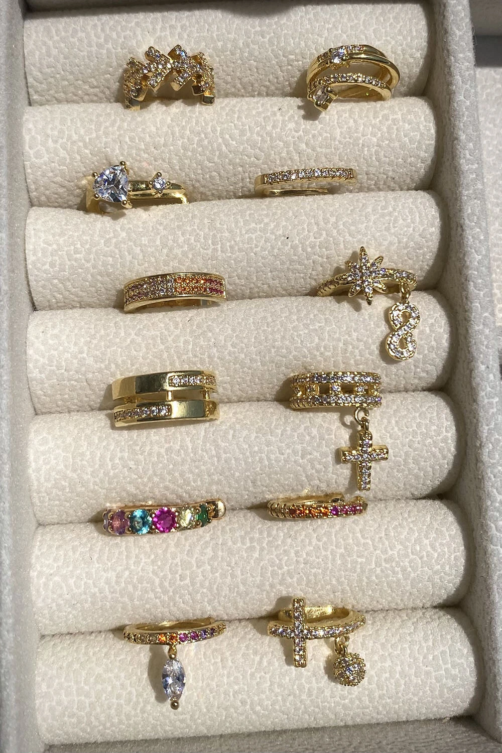 Fake piercing cravejado com zircônias coloridas nos tons degrade, metal banhado no ouro 18k.
