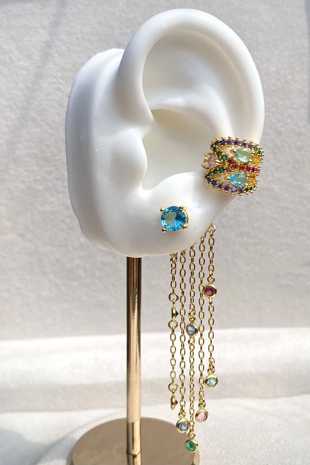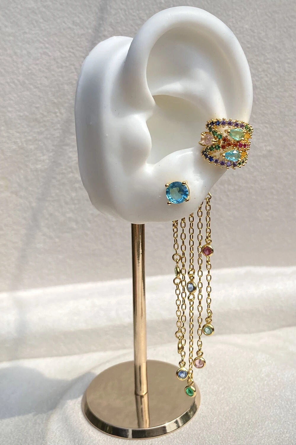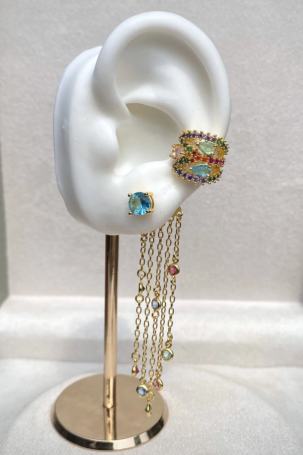Brinco franja com ponto de luz colorido de zircônias presa na tarracha, onde as franjas ficam na parte atrás na orelha, metal banhado no ouro 18k.