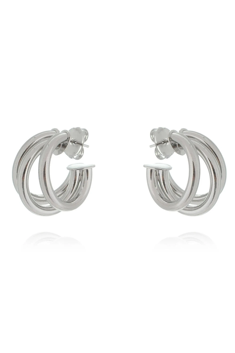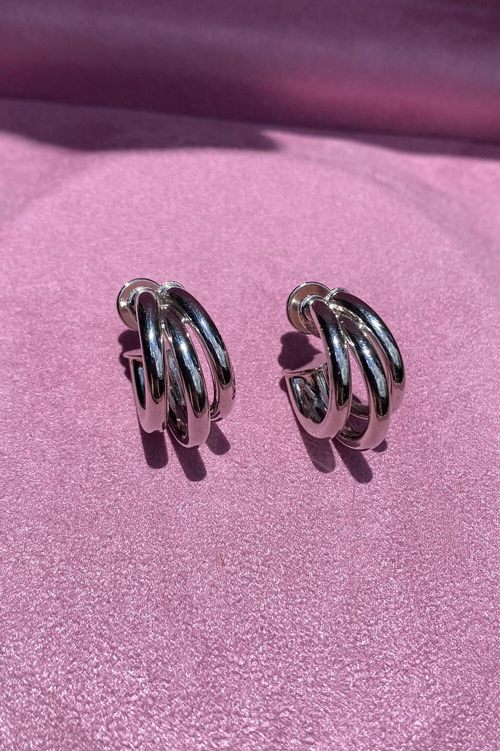 Brinco de argola 3 astes com detalhes nas bases no formato coração, metal banhado no ródio.