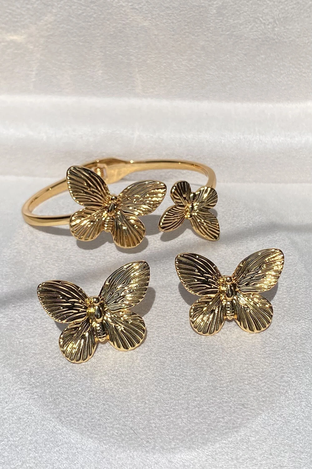 Bracelete com abertura mola com duas borboletas (maior e menor) acima com detalhes raiados nas asas, metal banhado no ouro 18k.