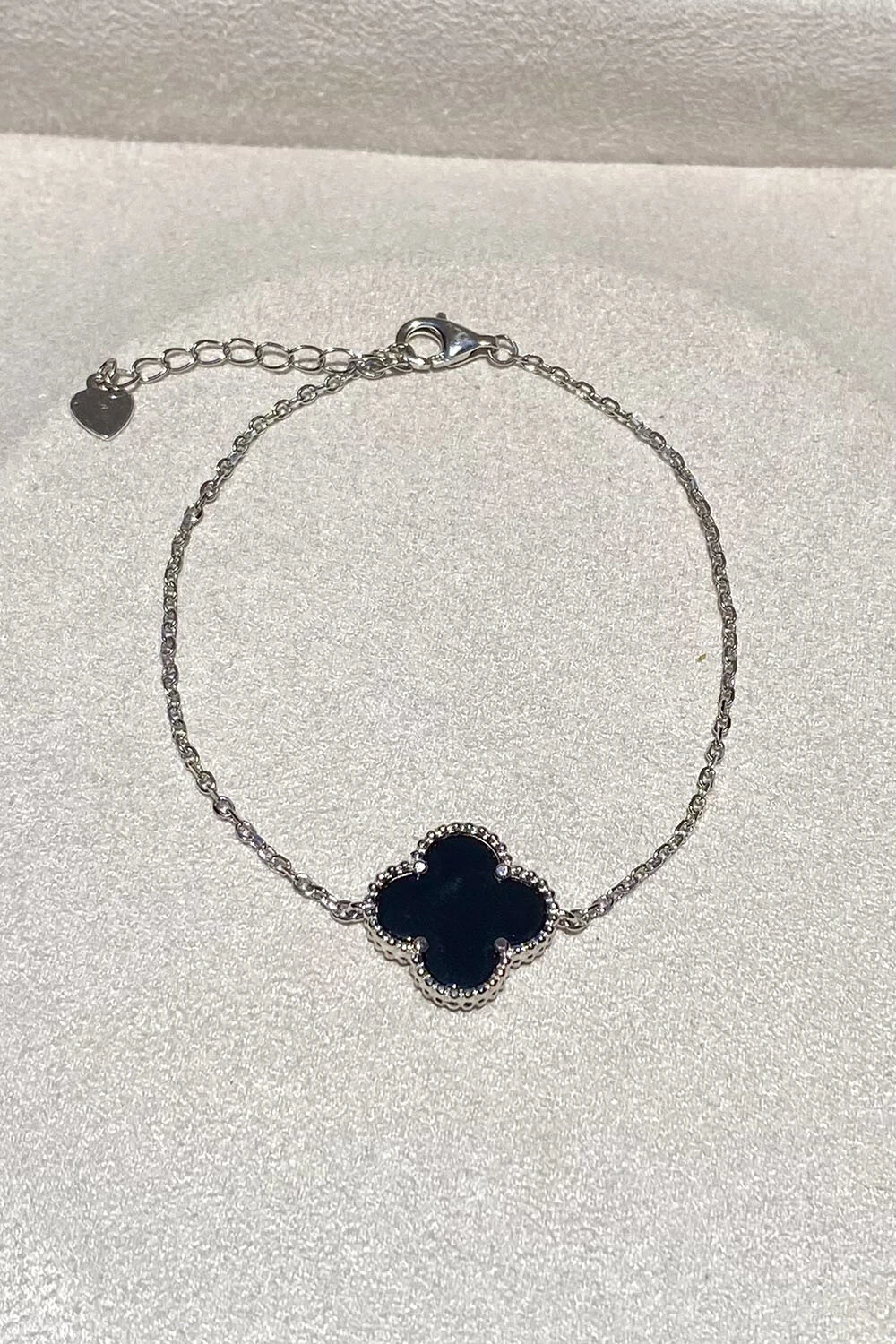 Pulseira trevo onix M, em prata 925 com banho de ródio branco.