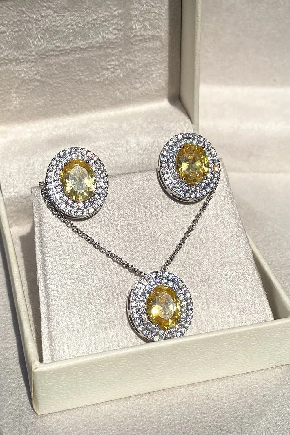 Conjunto colar e brinco oval com zircônia central yellow fancy e cravajado em volta com zircônias cristais, metal banhado no ródio branco.