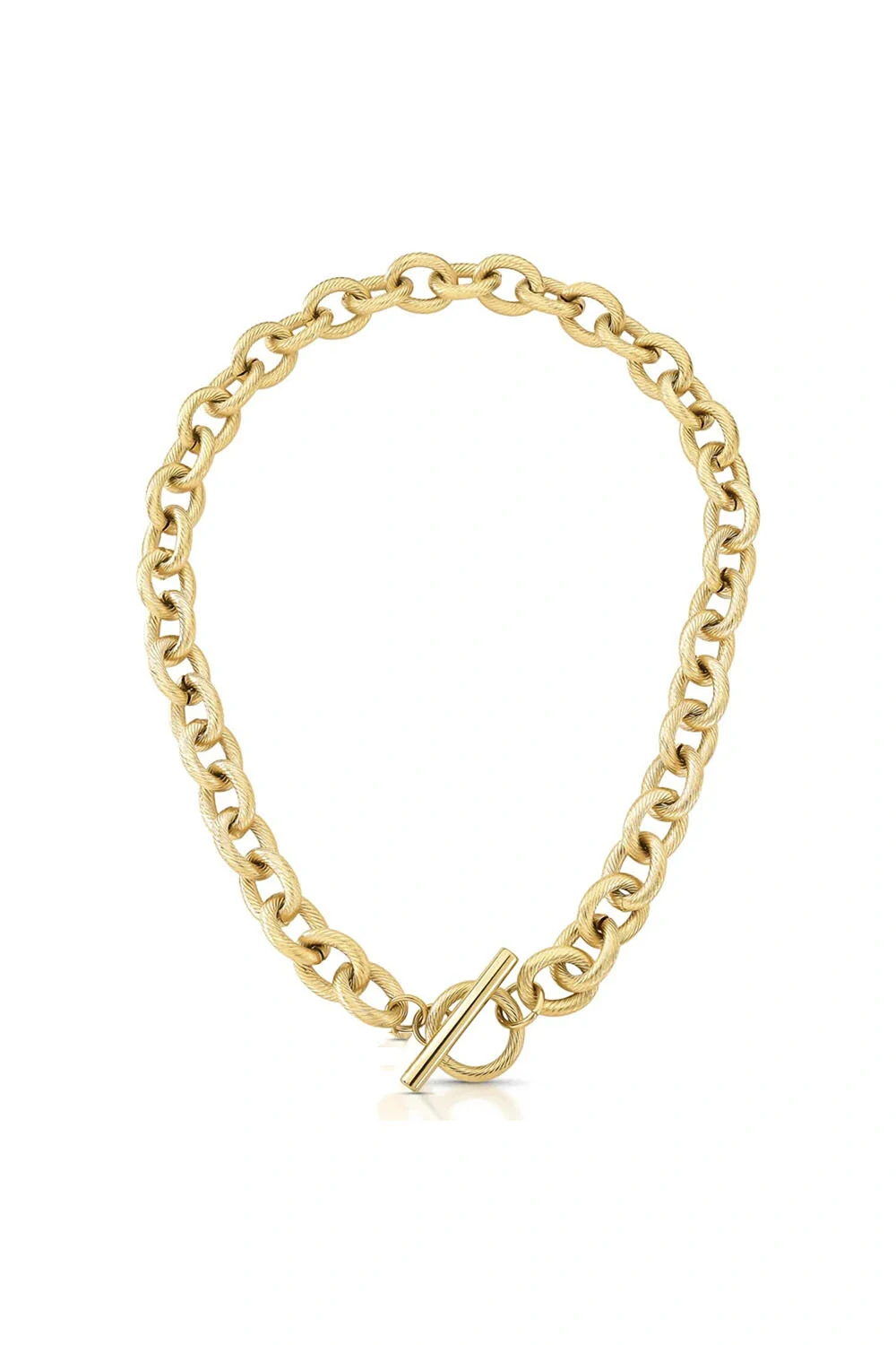 O design chunk (robusto) é composto por elos largos, que apresenta um acabamento frisado, a sofisticação de forma arrojada e garantindo um impacto visual e luxuoso. O fecho T, além de prático eleva o design do colar