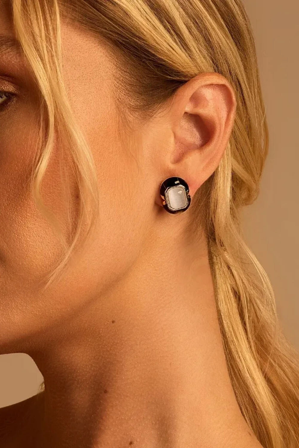 Brinco Dourado retangular detalhe olho de gato no centro e esmaltado com resina preta.