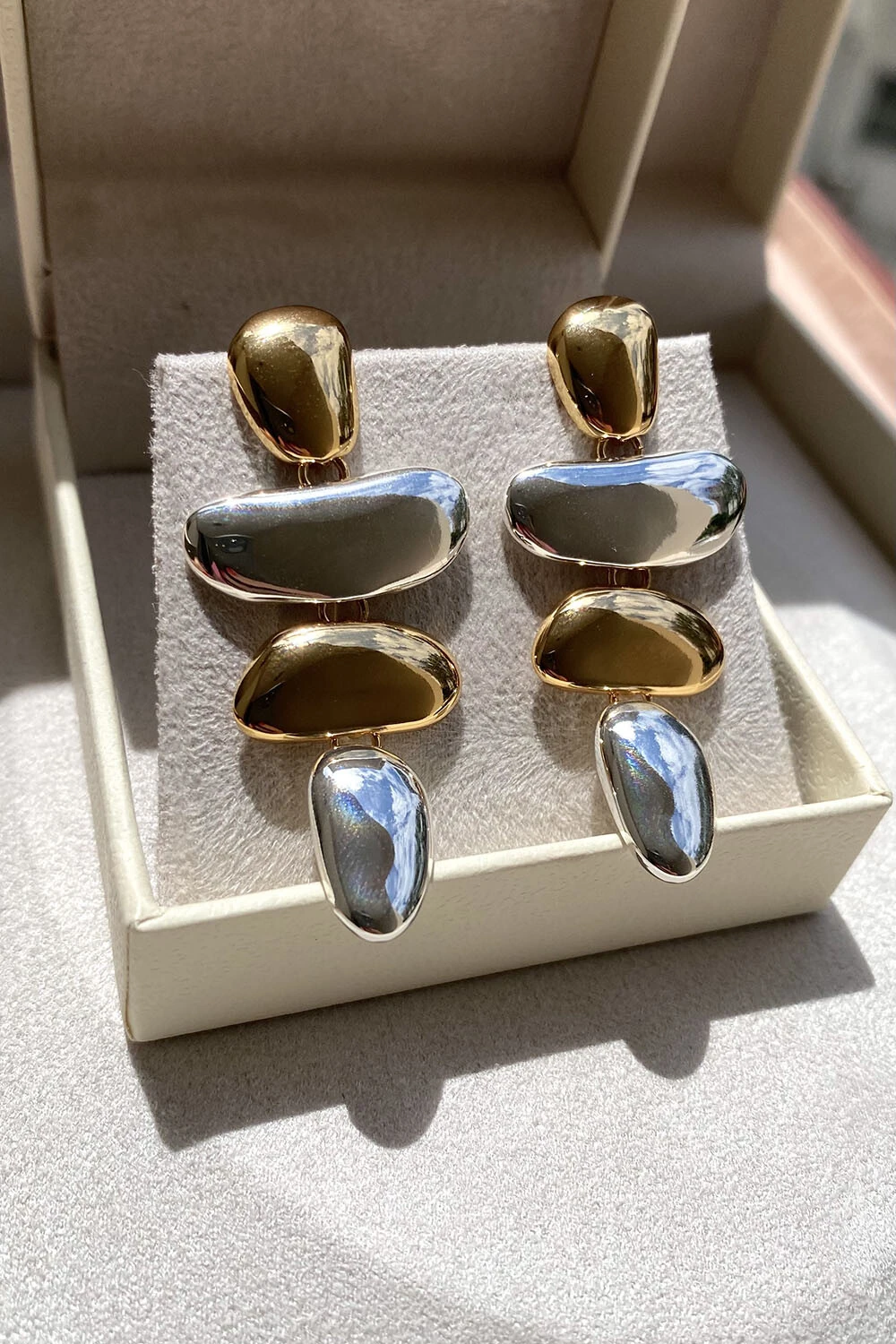 Brinco assimétrico com mix de banhos dourado e prateado com acabamento polido, esbanjando elegância.