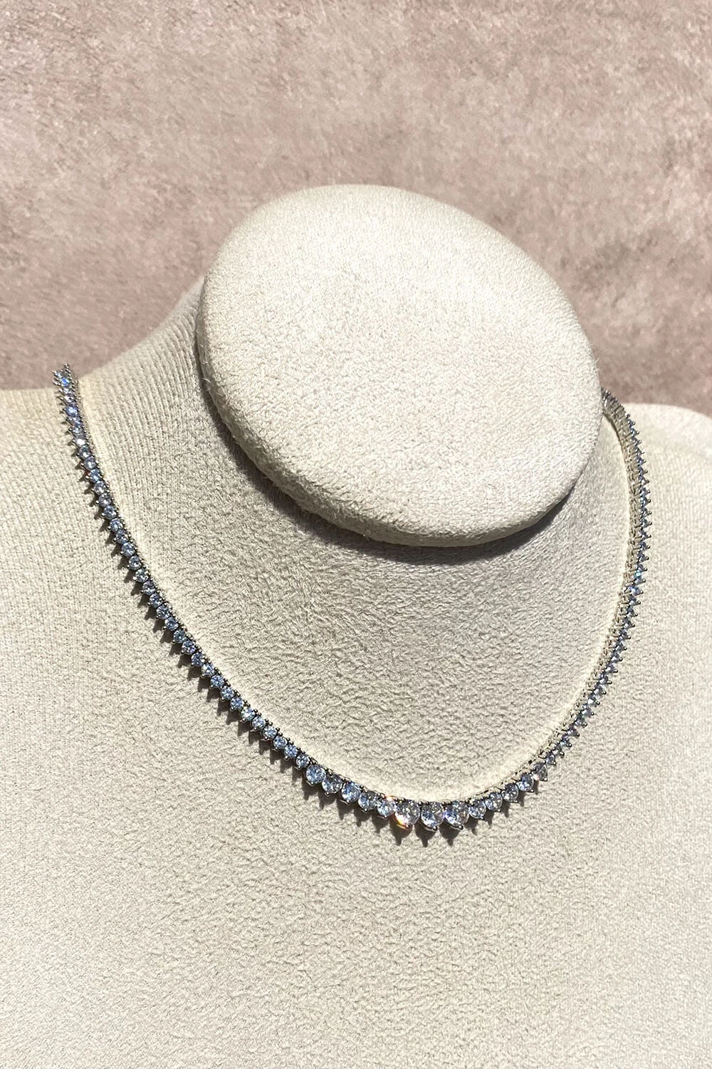 Colar Riviera zircônia três pontas 2mm e ao centro as zircônias aumenta tamanho 3mm e 5mm as zircônias, com fecho joia gaveta, toda delicadeza clássica e elegância, metal banhado no ródio Branco.