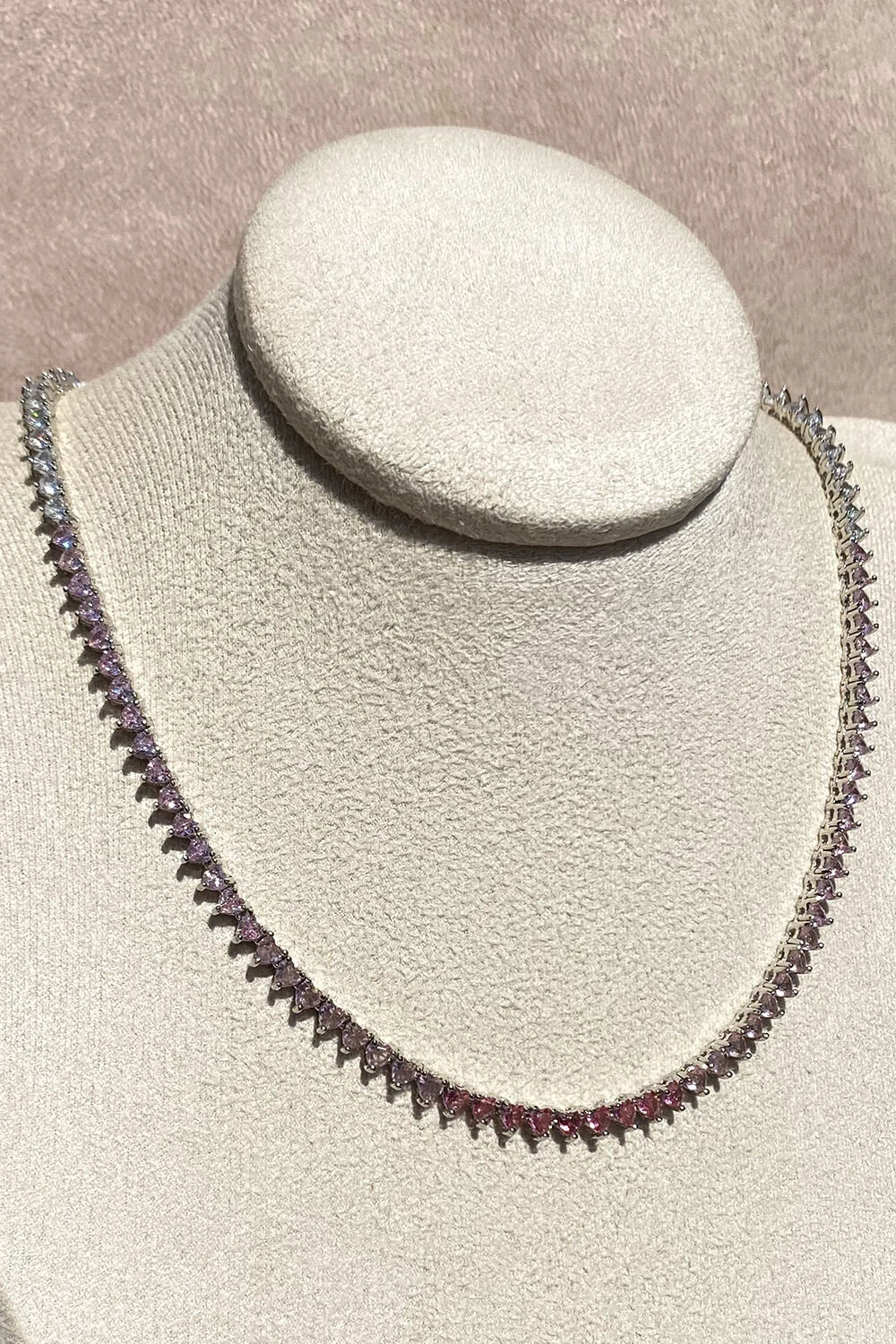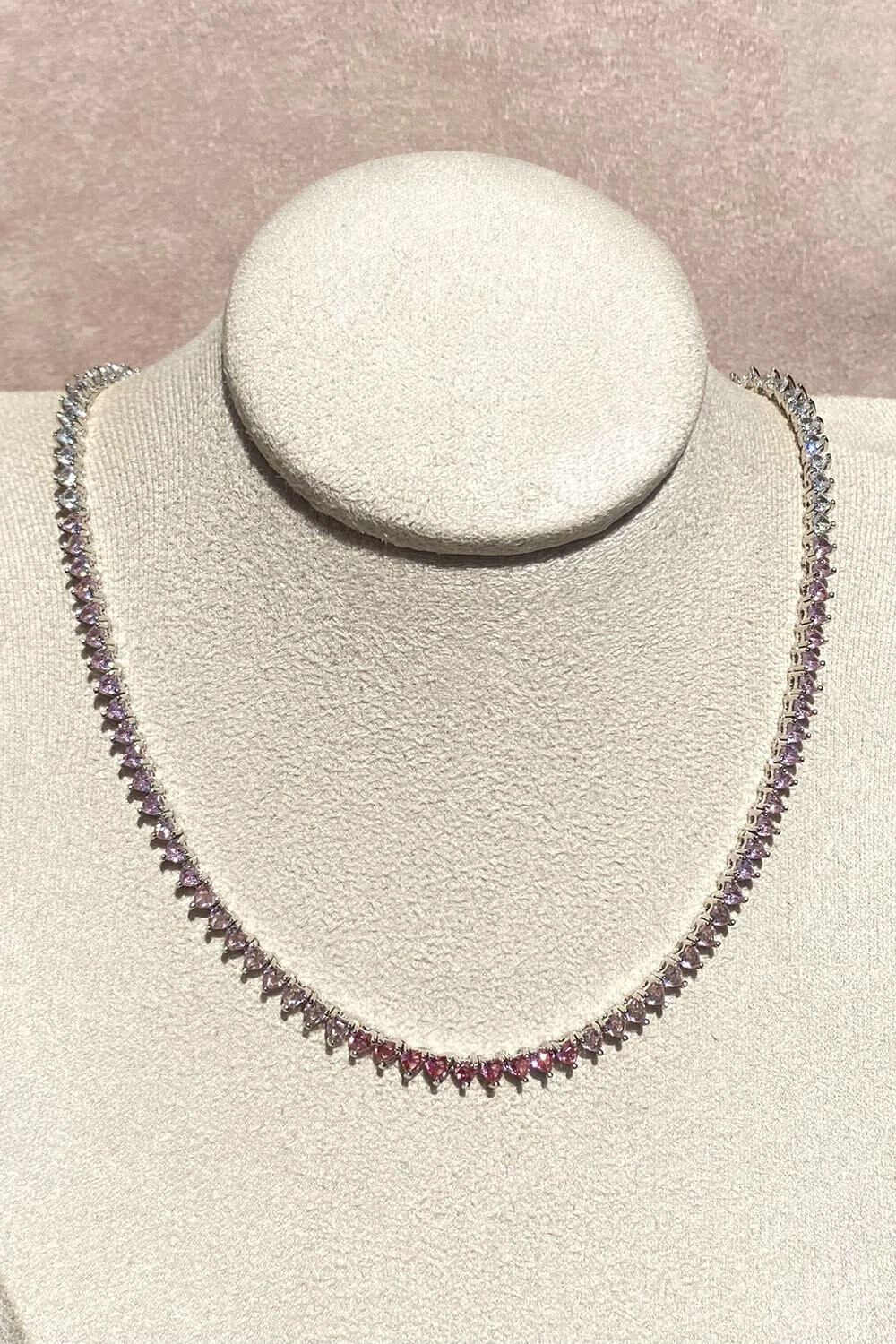 Colar Riviera zircônia três pontas 3mm cores degrade cristal, rosa claro e ao centro rosa mais escuro, com fecho joia gaveta, toda delicadeza clássica e elegância, metal banhado no ródio Branco.