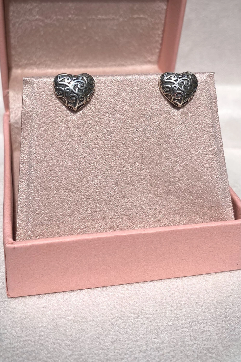 Brinco coração com desenhos torneados prata envelhecida, metal prata 925.