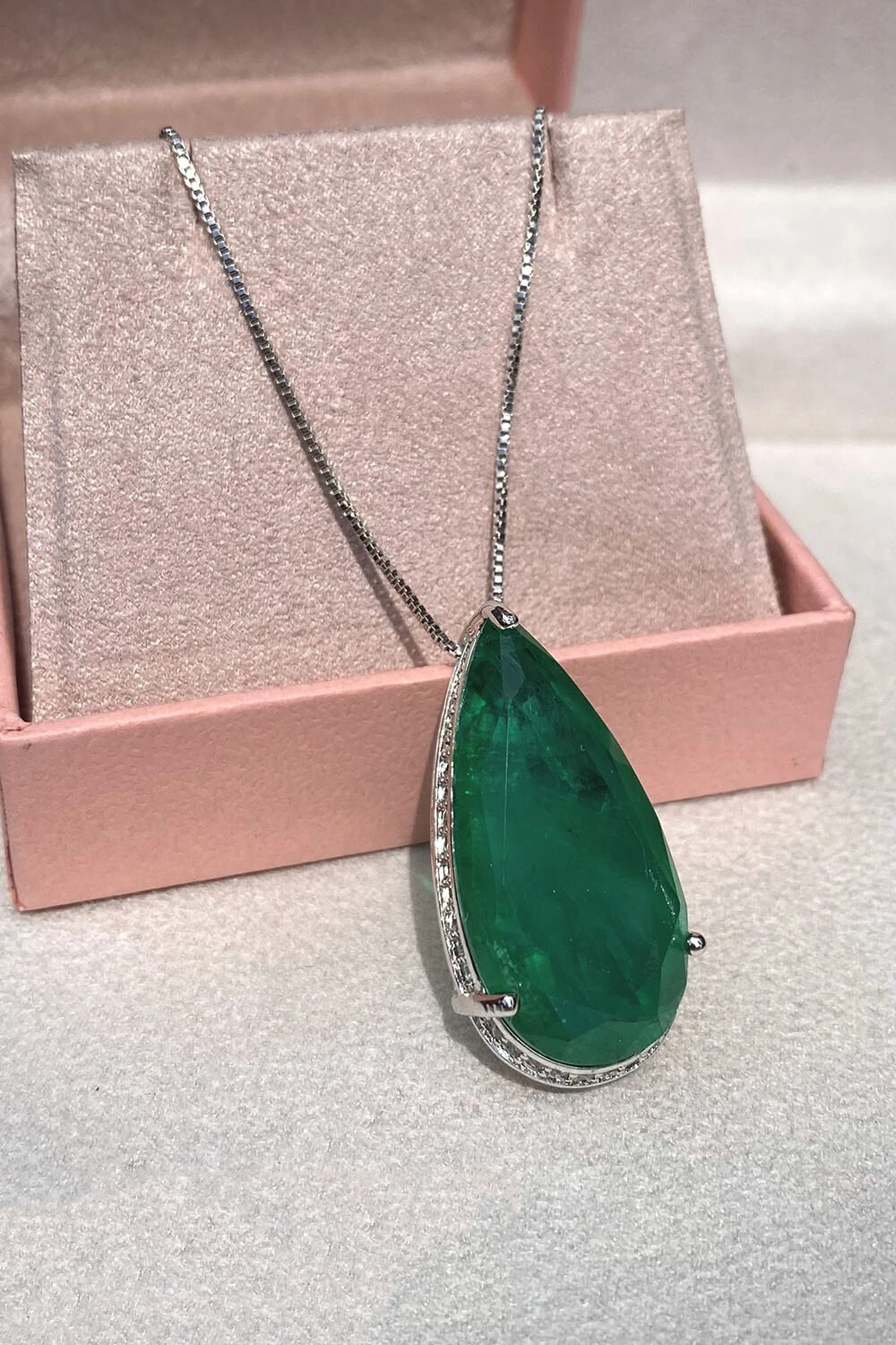 Colar gota pedra fusion esmeralda e cravejada em volta com zircônias, toda delicadeza clássica e elegância, metal banhado no ródio Branco.