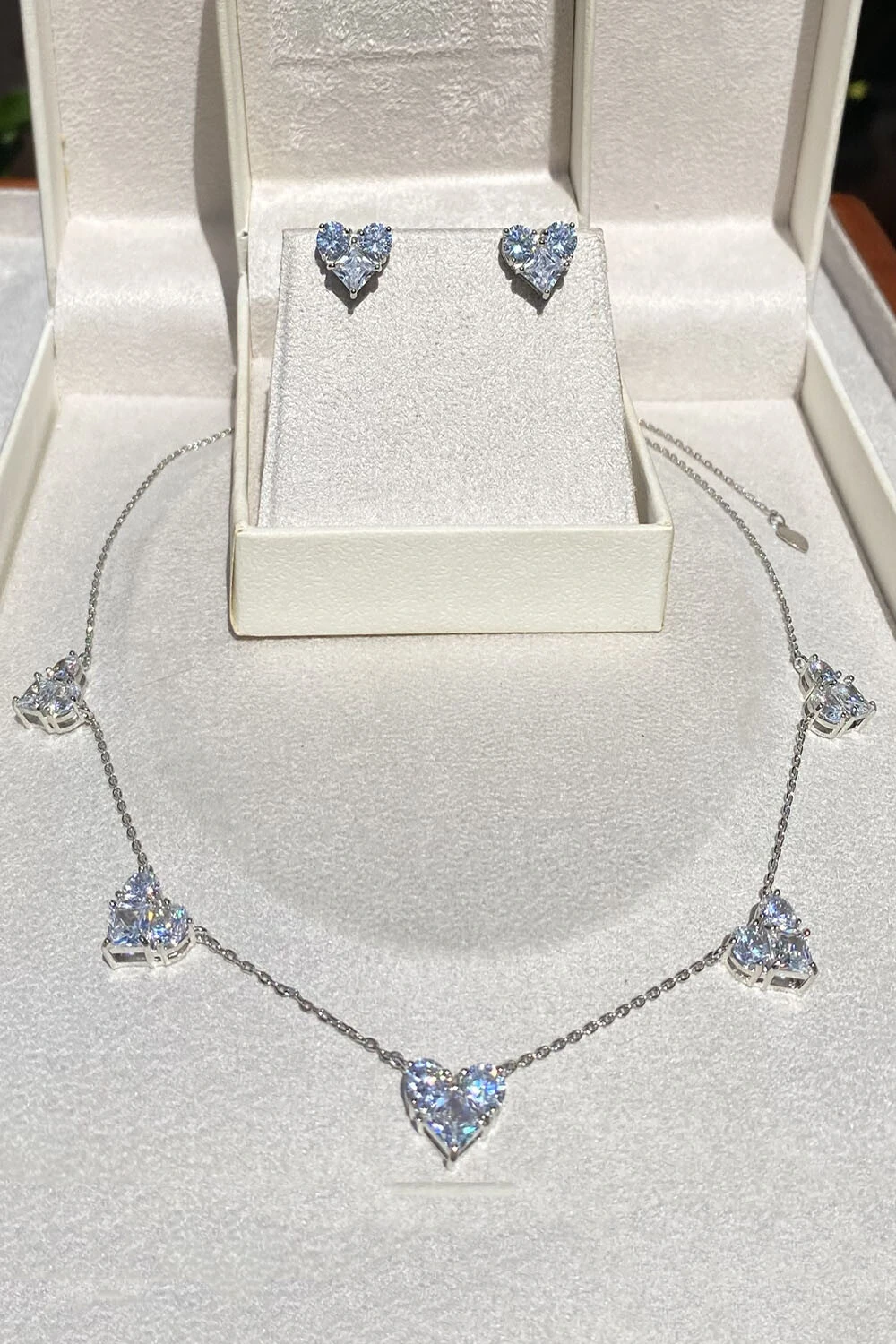 Conjunto colar e brinco coração cor cristal zircônias, metal banhado no ródio branco.