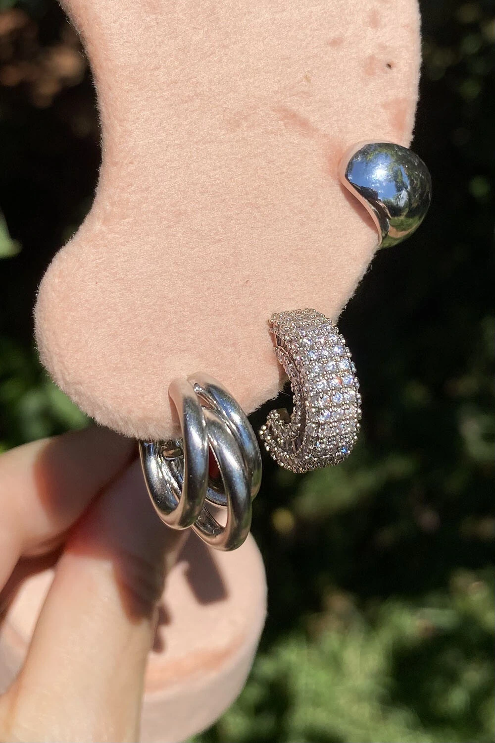 Brinco argola média cravejada zircônias frente e nas laterais zircônias formato baguetes, metal banhado ródio branco.